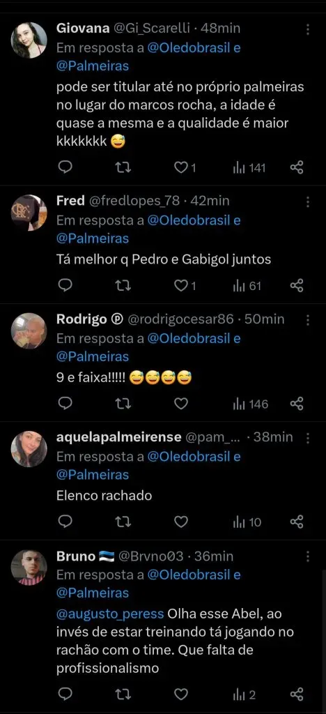 O Olé do Brasil, perfil humorístico dedicado ao futebol nacional, brinca que Abel Ferreira seria titular em times como Santos e Vasco da Gama.