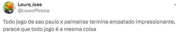 “Todo jogo de sao paulo x palmeiras termina empatado impressionante, parece que todo jogo é a mesma coisa”, completou mais um torcedor.