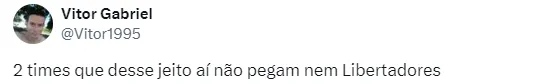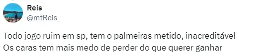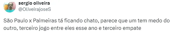 No “X”, antigo Twitter, os torcedores estão chateados com o resultado. “São Paulo x Palmeiras tá ficando chato, parece que um tem medo do outro, terceiro jogo entre eles esse ano e terceiro empate” comentou um torcedor.