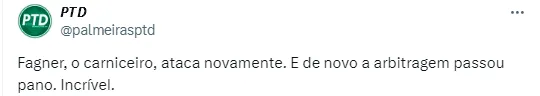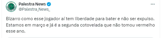 Pelo X, o antigo Twitter, alguns adeptos do Maior Campeão Nacional, relembraram do histórico do lateral e se indignaram com o fato dele só ter levado cartão amarelo: “Bizarro como esse jogador aí tem liberdade para bater e não ser expulso. Estamos em março e já é a segunda cotovelada que não tomou vermelho esse ano”, dizia uma publicação.