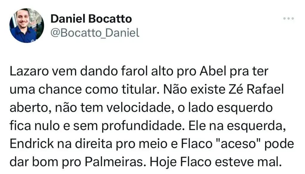 “Já acho que tem que voltar pro 4-3-3 com o Lázaro na ponta e o Rios saindo do time. Monta o time igual jogava em 2022, melhor Palmeiras da era Abel”, afirmou um palmeirense.