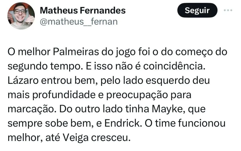 “O melhor Palmeiras do jogo foi o do começo do segundo tempo. E isso não é coincidência. Lázaro entrou bem, pelo lado esquerdo deu mais profundidade e preocupação para marcação. Do outro lado tinha Mayke, que sempre sobe bem, e Endrick. O time funcionou melhor, até Veiga cresceu”, pontuou um internauta.