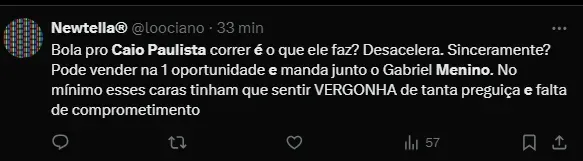 “Quem tem Breno Lopes, Caio Paulista, Menino e por aí vai fica fácil criticar”, “Bola pro Caio Paulista correr e o que ele faz? Desacelera. Sinceramente? Pode vender na 1 oportunidade e manda junto o Menino” e “Tem que sair Gabriel Menino, Breno Lopes e Caio Paulista. Chega desses bagres“, foram opiniões.