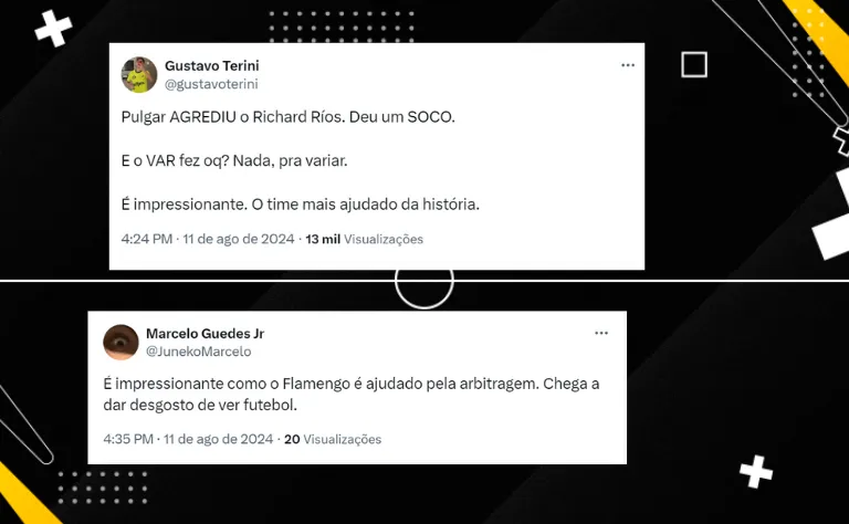 “Pulgar deu uma porrada no Richard Ríos. VAR nem chamou. O VAR só funciona 100% para o Flamengo”, afirmou outro palmeirense na web. Vale lembrar que Leila Pereira havia reclamado da expulsão de Abel na Copa do Brasil.
