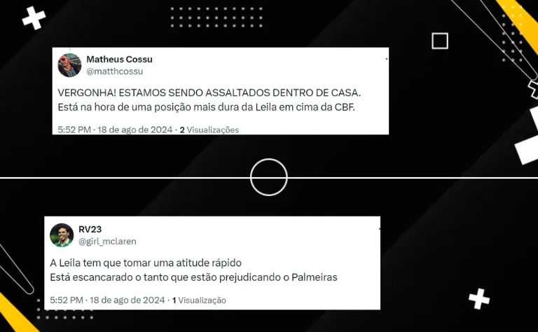 “Leila precisa ir amanhã na CBF, o que aconteceu no jogo de hoje é inaceitável”, disse um torcedor palestrino na rede social do X (veja outros comentários ao fim da matéria). O torcedor vê a equipe sendo prejudicada nos últimos jogos.