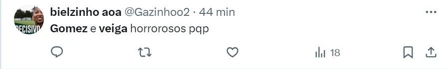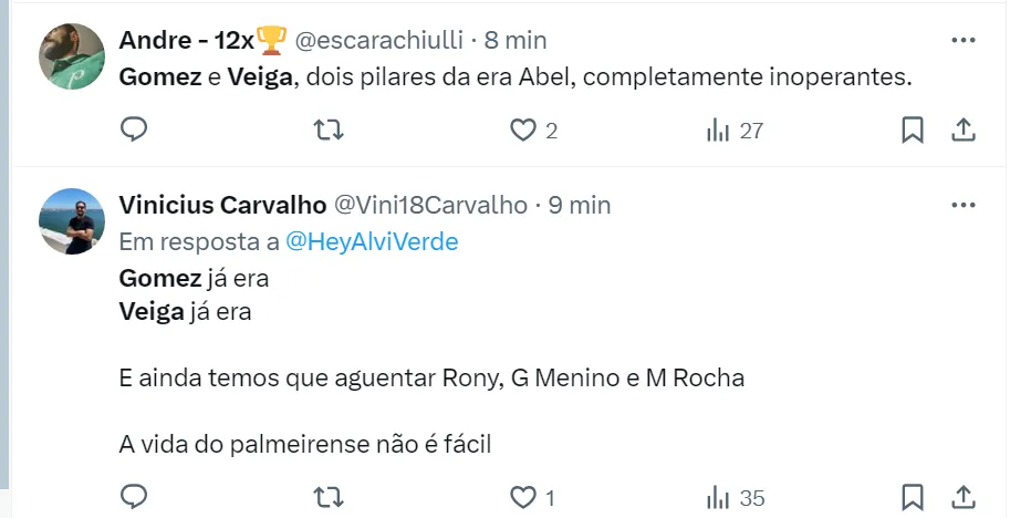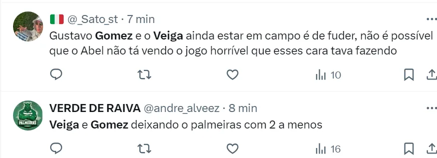 “Gomez e Veiga, dois pilares da era Abel, completamente inoperantes”, disse um torcedor no X. De novo, Veiga e Gomez jogam pelo nome…”, afirmou outro palestrino na web (veja mais comentários ao fim da matéria).
