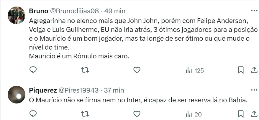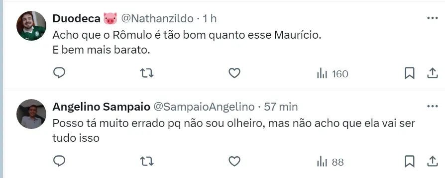 Na rede social do X, alguns torcedores comentaram que preferem Rômulo, que a presidente Leila Pereira comprou junto ao Novorizontino por R$ 6 milhões. Outros opinaram que o jogador do Internacional ‘não vale tudo isso’.