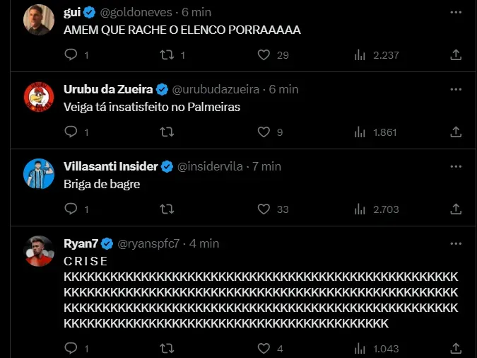 “Rony e Veiga discutiram feio agora aqui no Allianz Parque. Nunca tinha visto isso no Palmeiras do Abel. Endrick e Kevin apaziguaram. Tá complicado”, destacou o palmeirense Gabriel Amorim (@gabrilamorim), do Podporco, para rapidamente explanar o que aconteceu entre os craques.