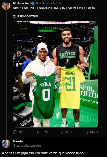 Nesta terça-feira, o atacante de 17 anos marcou presença no TD Garden para assistir ao confronto entre Boston Celtics e Cleveland Cavaliers. Antes do início da partida, Endrick teve a oportunidade de trocar camisas com Jayson Tatum, estrela dos Celtics.