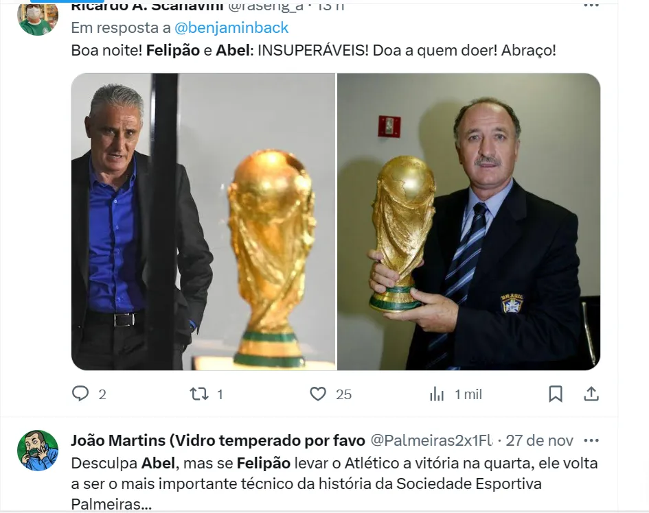 Por sua vez, Abel, que foi convocado por Felipão como jogador para a seleção de Portugal uma vez, ajudou o Palmeiras a ganhar mais duas Libertadores (2020 e 2021) no total de oito troféus em três anos.