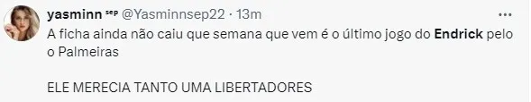 A atacante foi bicampeão brasileiro, bicampeão paulista e campeão da Supercopa do Brasil, marcando 21 gols com o time profissional do Verdão. Vale lembrar que Endrick poderia jogar sua última partida no dia 02 de junho contra o Criciúma pelo Brasileirão, porém está suspenso devido receber seu terceiro cartão amarelo.