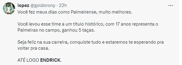 O craque Endrick se despede do Palmeiras na quinta-feira (30), diante do San Lorenzo, às 19H pela Copa Libertadores, pois seguirá para a Seleção brasileira para disputa da Copa América e em seguida se apresentará ao Real Madrid.