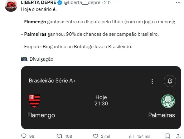 Além disso, atualmente, a diferença entre o Palmeiras e o Flamengo é de 6 pontos, o time carioca ocupa a 6ª posição na tabela, com 53 pontos somados até aqui. Sendo assim, é um jogo direto da parte de cima, porém, para o Palmeiras, um bom resultado pode fazer a diferença.