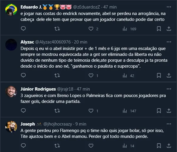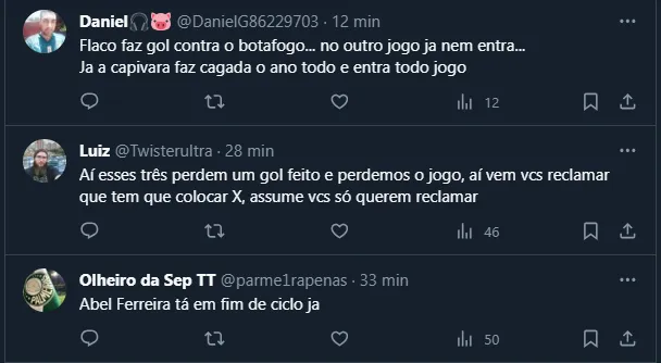 Até por isso, alguns torcedores palestrinos estão reclamando da insistência de Abel Ferreira com alguns atletas, como Breno Lopes. Ademais, a opção com três zagueiros também não é bem vista.