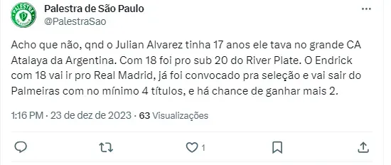 Isso porque o jogador de apenas 17 anos já garantiu bonificações para o Palmeiras, conforme o acordo firmado com o Real Madrid no momento que selou a venda da promessa. Sendo assim, uma alta quantia irá entrar nos cofres.