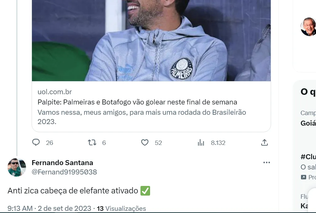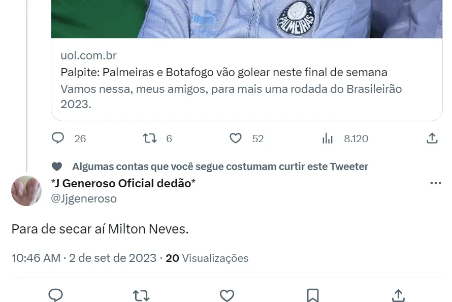 “Corinthians 0 x 4 Palmeiras. Está mais na cara que nariz que o Verdão atropelará o Timão em Itaquera”, disse em sua coluna no UOL Esporte. O palpite de Milton Neves já chegou na torcida do Palmeiras e, em tom de brincadeira, acionou o modo ‘anti-zika’ para a opinião do apresentador não atrapalhar o time de Abel. Os palmeirenses acreditam que ele queira secar o Verdão (como pode ser visto nos tweets acima).
