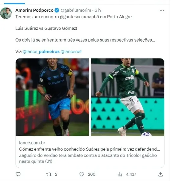 O Palmeiras enfrenta o Grêmio nesta quinta-feira (21), pelo Campeonato Brasileiro. O confronto coloca frente a frente dois estrangeiros e grandes jogadores que atuam no futebol brasileiro: Gustavo Gómez e Luis Suárez. Os dois se enfrentam pela primeira vez vestindo as camisas de seus respectivos clubes, mas em outros momentos já se enfrentaram.