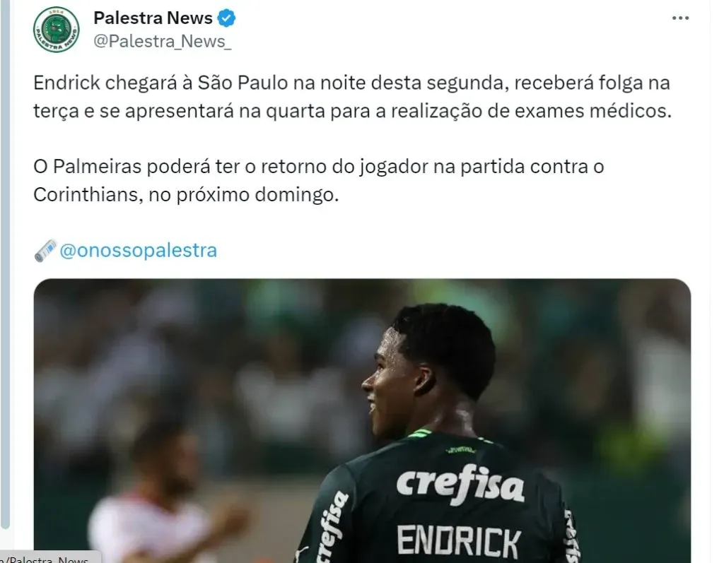 O setorista Leonardo Barbieri, do portal NOSSO PALESTRA, apurou que Endrick desembarca em São Paulo na noite desta segunda-feira (12). Vai receber folga na atividade desta terça (13) e passará por novos exames médicos na Academia de Futebol no dia seguinte.