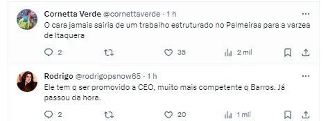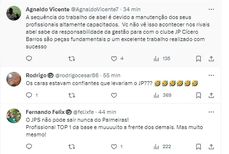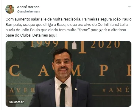 “Com aumento salarial e de multa rescisória, Palmeiras segura João Paulo Sampaio, craque que dirige a Base, e que era alvo do Corinthians! Leila ouviu de João Paulo que ainda tem muita ‘fome’ para gerir a vitoriosa base do Clube”, publicou Hernan.