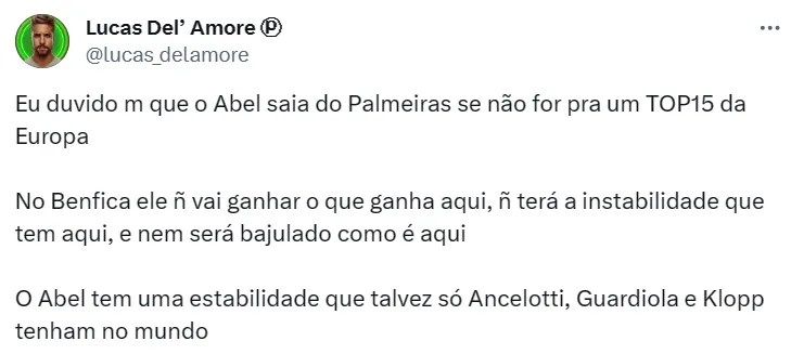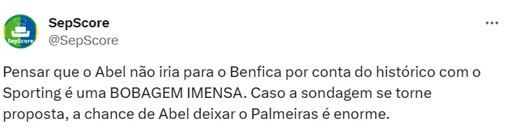 “Neste cenário, Abel Ferreira preenche todas as caixinhas que o Benfica necessita”, completou. O contrato de Abel com o Palmeiras é válido até o fim de 2024 e ainda não há conversas para renovação.