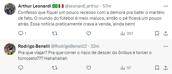 A torcida, além de ficar contente com a contratação de mais um jovem, ainda pede pela contratação de um atacante para suprir a ausência de Endrick. Os torcedores entendem que os atacantes do elenco não têm capacidade de desempenhar o mesmo que a joia.