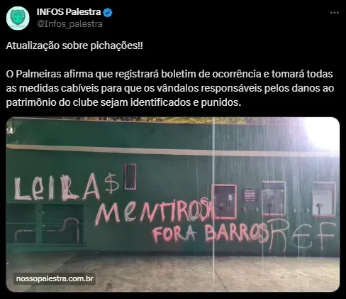 Os muros do Allianz Parque amanheceram pichados com protestos contra Leila Pereira, presidente do Palmeiras, e Anderson Barros, diretor de futebol do clube após derrota de 2 a 1 para o Santos. “Leila mentirosa” e “Fora Barros” foram os dizeres da manifestação. A Mancha Alvi Verde, principal torcida organizada palmeirense, esclareceu que não é a responsável pelas pichações, mas reiterou suas cobranças à diretoria e ao time. A organização de torcedores tem mantido uma postura crítica em relação aos membros da diretoria, embora não tenha assumido a autoria desses atos de vandalismo.