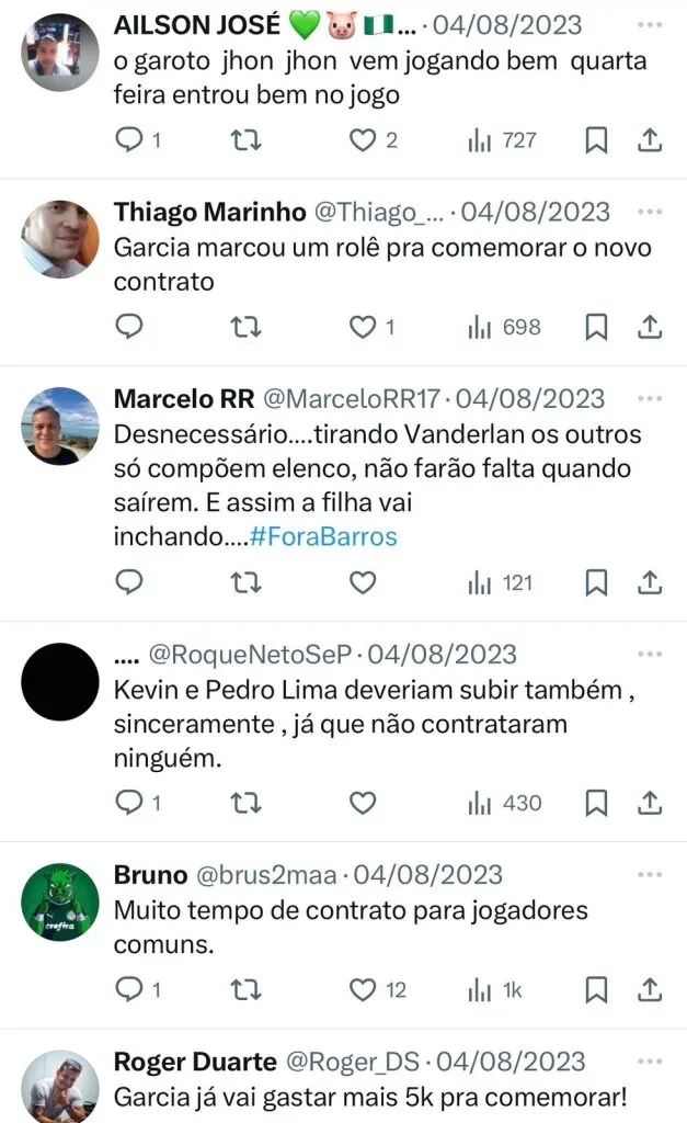 Ainda segundo o Uol Esporte, o Palmeiras trabalhou na renovação de vários contratos das Crias da Academia, e em multas rescisórias altas nos últimos meses. Kaique, Mateus, Luis Guilherme e Estevão têm contrato até 2026. Garcia, Vanderlan, Naves, Fabinho, Gabriel Menino, Jhon Jhon até 2027. As multas deles são astronômicas, e as sondagens acabam não gerando propostas. O Palmeiras conta com eles, e acredita no potencial de todos a longo prazo.