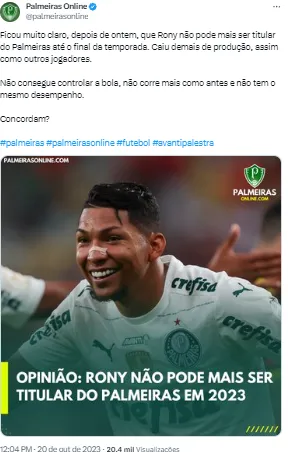 Além desse mau momento coletivo que vem gerando essa sequência de jogos sem vencer, individualmente algumas peças também não vivem seus melhores momentos. Vários jogadores do time de Abel Ferreira estão passando por uma fase complicada. Um desses casos é o atacante Rony.