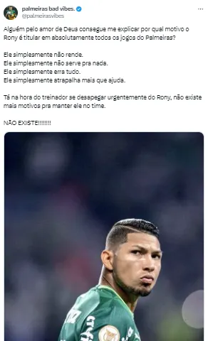 Não bastasse isso, um atenuante negativo para a situação de Rony foi a forte discussão com o meia Raphael Veiga dentro de campo na derrota contra o Atlético-MG. Os dois envolvidos tiveram de ser contidos pelos demais companheiros.