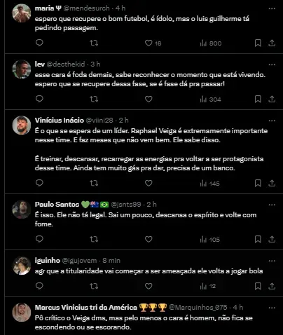 Veiga completou seu pronunciamento destacando sua alegria em jogador no Palmeiras e ainda parabenizou Luís Guilherme pelo gol decisivo. “Sou muito feliz de participar dessa equipe. Focada, resiliente e pronta para passar por qualquer situação, em qualquer lugar. Parabéns, Luís Guilherme. Muito feliz por você e pelo gol que tanto buscava ter saído em um jogo especial”, escreveu.
