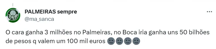 A situação virou motivo de chacota para os palmeirenses, que inclusive brincam que para isso acontecer o Boca teria de vender a Bombonera, seu próprio estádio. Além disse, o clube hermano não vive uma boa fase financeira.