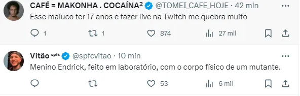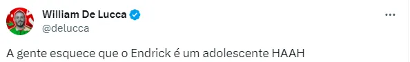 Pelo Twitter, alguns torcedores foram à loucura com a atitude do jovem em uma partida que poderia valer o título do Verdão: “A gente esquece que o Endrick é um adolescente”, brincou um torcedor.5