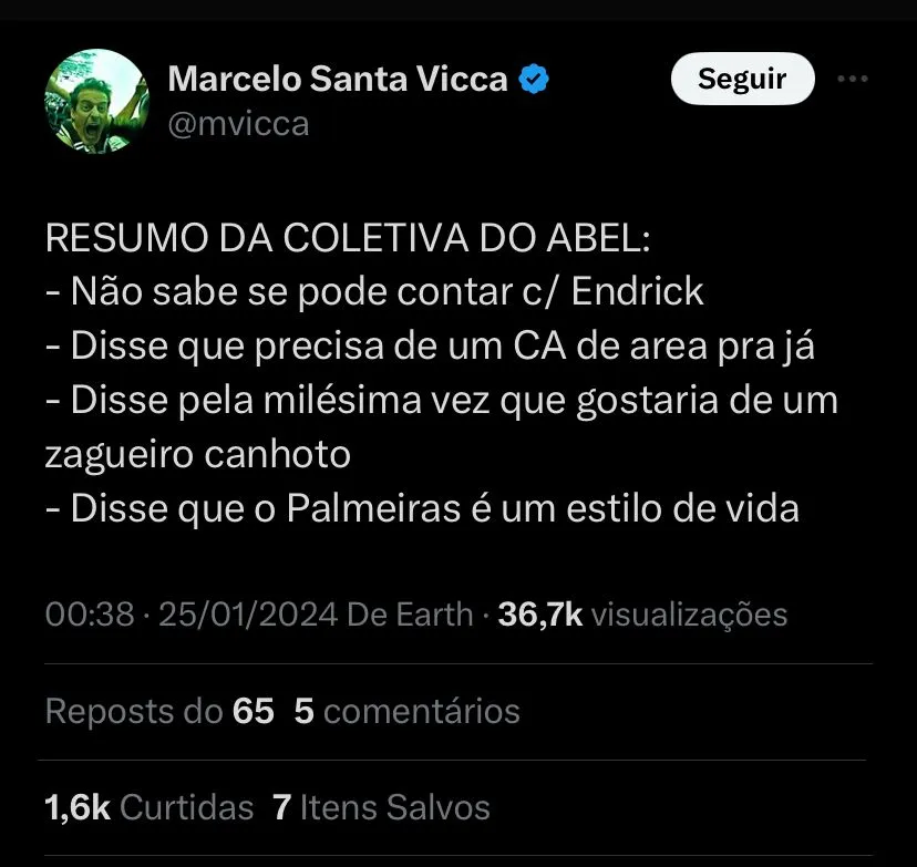 Ainda em coletiva, Abel demonstrou preocupação com a procura de uma reposição para o camisa 9: “Endrick, para ser muito sincero, não sei com que cabeça ele vem depois. Se vem com a cabeça no Palmeiras, se vem com a cabeça no Real Madrid. Sei que o clube tem que ir atrás de uma opção para ele”, disse.