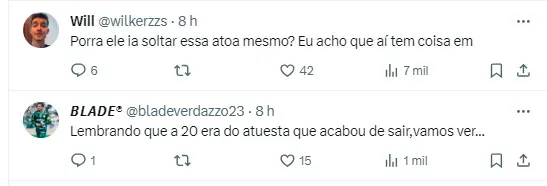 Em uma foto com os dois jogadores, Endrick escreveu: “E aí, vem ou não?”, seguido de um coração verde. Em baixo havia outra mensagem escrita: “20 te espera”. Vale lembrar que Atuesta, que era o dono da vestimenta, acabou de deixar a equipe.