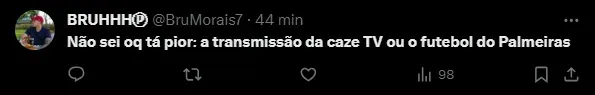 “Pior que na época que tinha que botar Bombril na antena“, “Se não fosse trágico, seria cômico!!“, “Não sei oq tá pior: a transmissão da Caze TV ou o futebol do Palmeiras” e “A transmissão da Cazé TV combinando com esse time horroroso do Palmeiras“, foram alguns comentários.