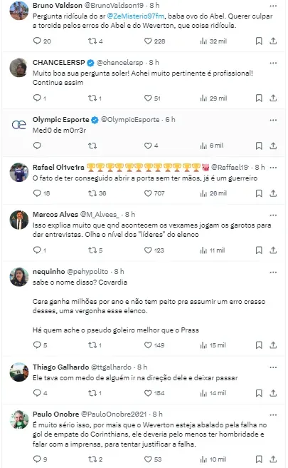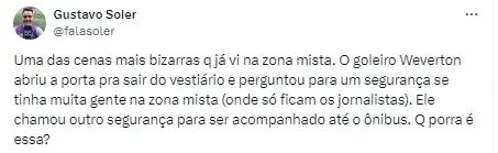 “Uma das cenas mais bizarras que já vi na zona mista. O goleiro Weverton abriu a porta pra sair do vestiário e perguntou para um segurança se tinha muita gente na zona mista (onde só ficam os jornalistas). Ele chamou outro segurança para ser acompanhado até o ônibus”, publicou o repórter.