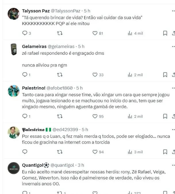 “E aí, tio? Vai ficar xingando torcedor mesmo?”, questionou um perfil, que foi retrucado por Zé Rafael: “Se me xingar, eu xingo de novo. Se parecer ofensivo eu faço o mesmo, não quero que fique dando moral também só quero que respeita e, se não tiver nada para falar, melhor ficar calado”.