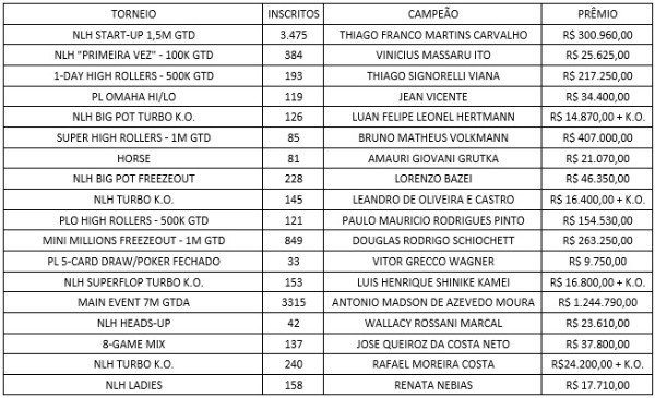 Obviamente, alguns torneios, apesar de muito parecidos, sofreram modificações, seja na estrutura ou na premiação garantida. É o caso, por exemplo do torneio “PRIMEIRA VEZ by COPAG”, que teve a sua premiação garantida dobrada para 100.000 reais. Já o evento número 13 “MINI MILLIONS”, ano passado era o “NLH FREEZEOUT” e tinha o valor do buy-in menor e sem premiação garantida. Ou seja, este ano o “MINI MILLIONS” deve inflar ainda mais o bolso do seu ganhador.
