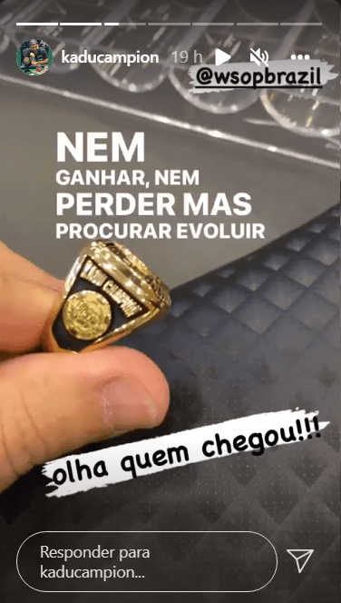 Kadu levou a joia para o BSOP e exibiu a mesma para os amigos. Nas redes sociais, a esposa dele, a também profissional do poker Milena Magrini, repostou uma imagem do anel e ficou toda orgulhosa. Richard Godoy, jogador regular dos principais torneios foi um dos que experimentou a joia e comemorou o feito do amigo.