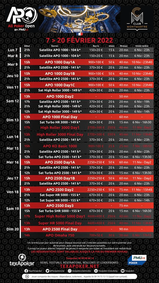 Conforme os casos de Covid 19 diminuem os organizadores dos torneios de poker ao vivo na França passam a oferecer competições de qualidade. Está previsto para os dias 7 a 20 de fevereiro o All Poker Open em Paris, organizado pela Texapoker a disputa vai ser realizada no Club Montmartre e a grande expectativa é a de que o craque do PSG, Neymar, possa comparecer já que ele adora um baralho.