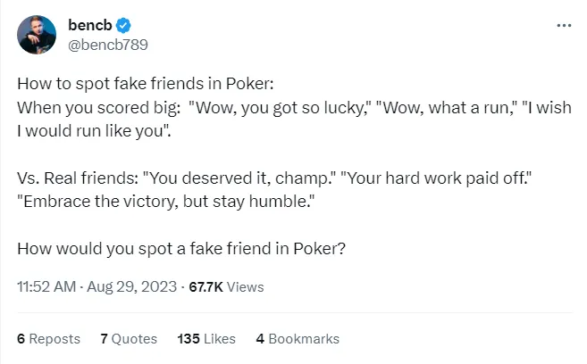 “Uau, como você teve sorte”, ou “Uau, que corrida” e ainda “Eu gostaria de correr como você”, são frases tipicamente ditas por aqueles que demonstram falsidade, ou até mesmo inveja das suas conquistas. Para Benjamin Rolle, verdadeiros amigos do poker vão comemorar as vitórias dos outros dizendo: “você mereceu, campeão”, “seu trabalho duro valeu a pena”, “abrace a vitória, mas permaneça humilde”, escreveu o jogador alemão.