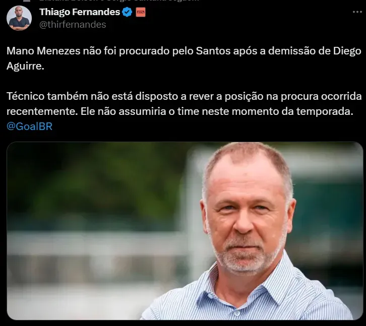 Um dos favoritos para assumir o comando santista seria Mano Menezes, que está livre no mercado, desde que deixou o Internacional no mês de julho. Porém, o jornalista Thiago Fernandes, do Goal trouxe uma informação BOMBÁSTICA sobre a situação do gaúcho e Rueda.