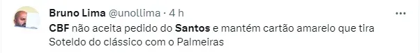 Após as expulsões de Rodrigo Fernández e Lucas Lima e o cartão amarelo recebido por Soteldo na goleada de 4 a 1 sobre o Vasco, no último domingo (1), o Santos tentou agir nos bastidores para anular a punição do último com o objetivo dele estar à disposição para o Clássico da Saudade, contra o Palmeiras, que será realizado neste próximo domingo (8). Porém acabou recebendo um não da CBF, que manteve os ganchos.