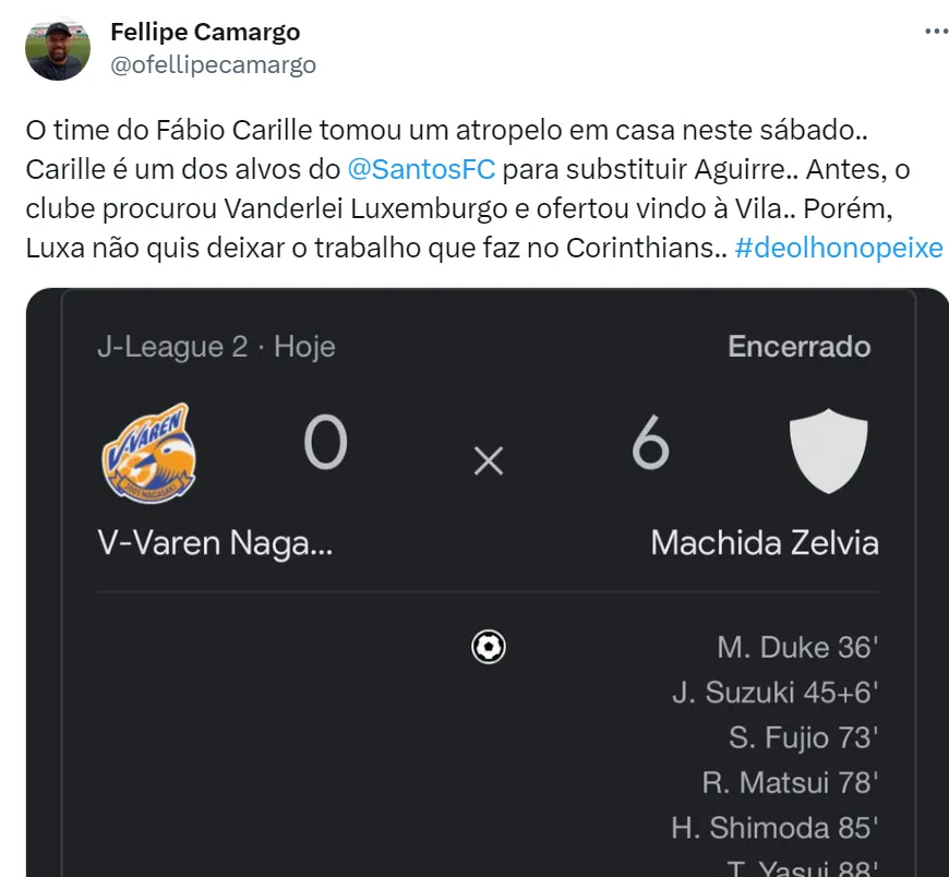 Com Luxemburgo dizendo não para o Santos, ainda segue em dúvida o nome do novo treinador do Clube da Vila Belmiro para o restante do ano. Fábio Carille é uma opção, mas a diretoria santista não avançou nas negociações e existe uma multa contratual que precisa ser paga para tirá-lo do V-Varen Nagasaki, do Japão. Rueda tem mandato de presidente no Peixe apenas até dezembro, o que complica a busca por um treinador.