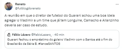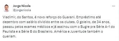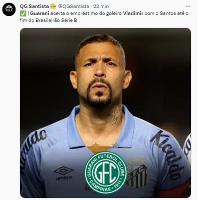 “Vladimir, do Santos, é novo reforço do Guarani. Empréstimo até dezembro com salário dividido entre os clubes”, iniciou o jornalista, trazendo a informação sobre o futuro do medalhão.