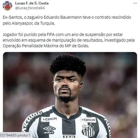 “Ex-Santos, o zagueiro Eduardo Bauermann teve o contrato rescindido pelo Alanyaspor, da Turquia. Jogador foi punido pela FIFA com um ano de suspensão por estar envolvido em esquema de manipulação de resultados, investigado pela Operação Penalidade Máxima do MP de Goiás”, informou o jornalista que cobre o Peixe.