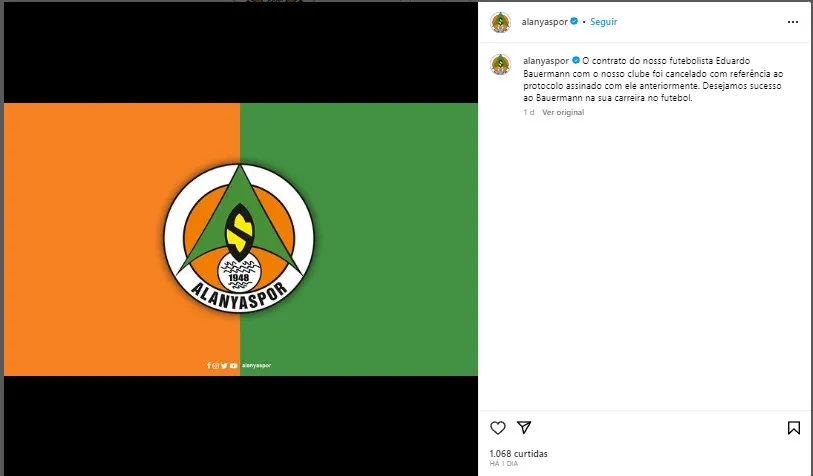 “O contrato do nosso futebolista Eduardo Bauermann com o nosso clube foi cancelado com referência ao protocolo assinado com ele anteriormente. Desejamos sucesso ao Bauermann na sua carreira no futebol”, informou Alanyaspor em um comunicado oficial.