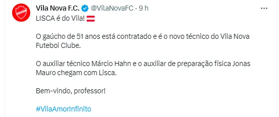 O destino de Lisca é o tradicional Vila Nova, de Goiás. A equipe goiana está disputando a Série B do Campeonato Brasileiro, ocupando atualmente o sétimo lugar com 46 pontos. O grande objetivo do ex-treinador do Alvinegro Santista será conseguir levar a se classificar para a divisão de elite do futebol brasileiro em 2024. Para isso, o Vila Nova precisa terminar a competição em pelo menos quarto lugar. O contrato dele com sua nova equipe irá até o fim da Segundona.