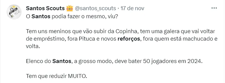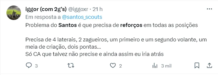 Com isso, a prioridade do Santos é a chegada de zagueiro, lateral-direito e um ponta. Mas, a gestão ainda analisa junto a comissão técnica a necessidade de um lateral-esquerdo e um volante. Apesar da movimentação, a gestão apenas analisa as possibilidades.
