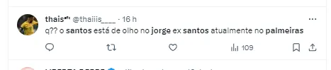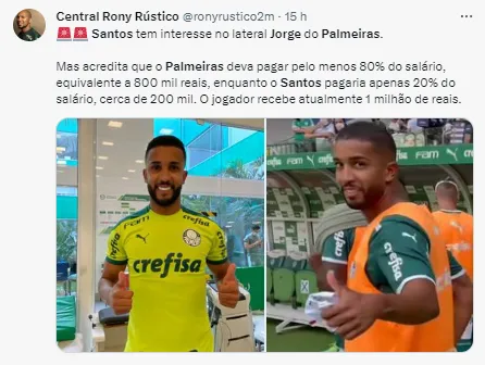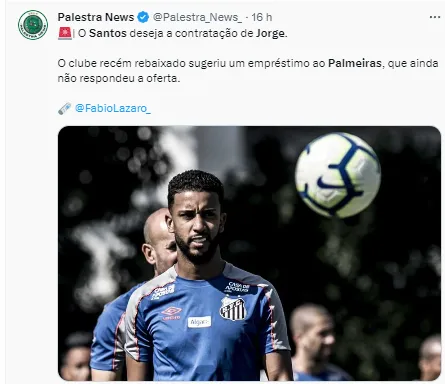 Jorge já foi comunicado pela diretoria que não está nos planos de Abel para o Palmeiras. Com isso, ele deve ter um novo destino no futebol brasileiro. Com isso, ele poderia ser um reforço do Santos em 2024, porém, pelo seu alto salário, ele teria de aceitar uma boa redução em seus ganhos mensais.
